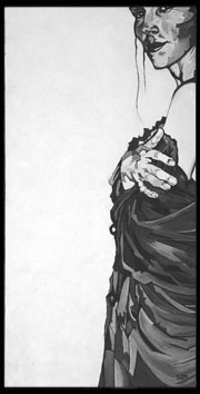 Lost Highway, 2002 I took some photographs of myself with the timer on my camera, at a time when I was really stressed out. Taking pictures seemed like something that would loosen me up and get me to relax. It was fun, but since I was standing in front of the camera, I couldn't see what was being captured. A lot of the pictures turned out being cropped in funny ways. This was one of them, but I liked the way the figure hovered on the edge. I decided to try painting it, but while I worked, I turned on a David Lynch movie called "Lost Highway". I was all alone in my cold, dark apartment, in the middle of the night, and the movie got more and more creepy. It must have affected the painting, since the photograph was not nearly as creepy as the painting became. When I see it, all I can think of is that scary night, which is why I had to name the painting after it. |